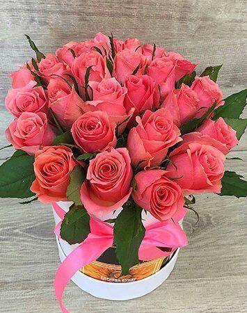 Роза 40 см - 23 шт., Оазис - 1 шт., Коробка шляпная средняя (от 12 до 21 см) - 1 шт., Лента атласная - 1 шт.Доставка 0₽ от 30-ти минут